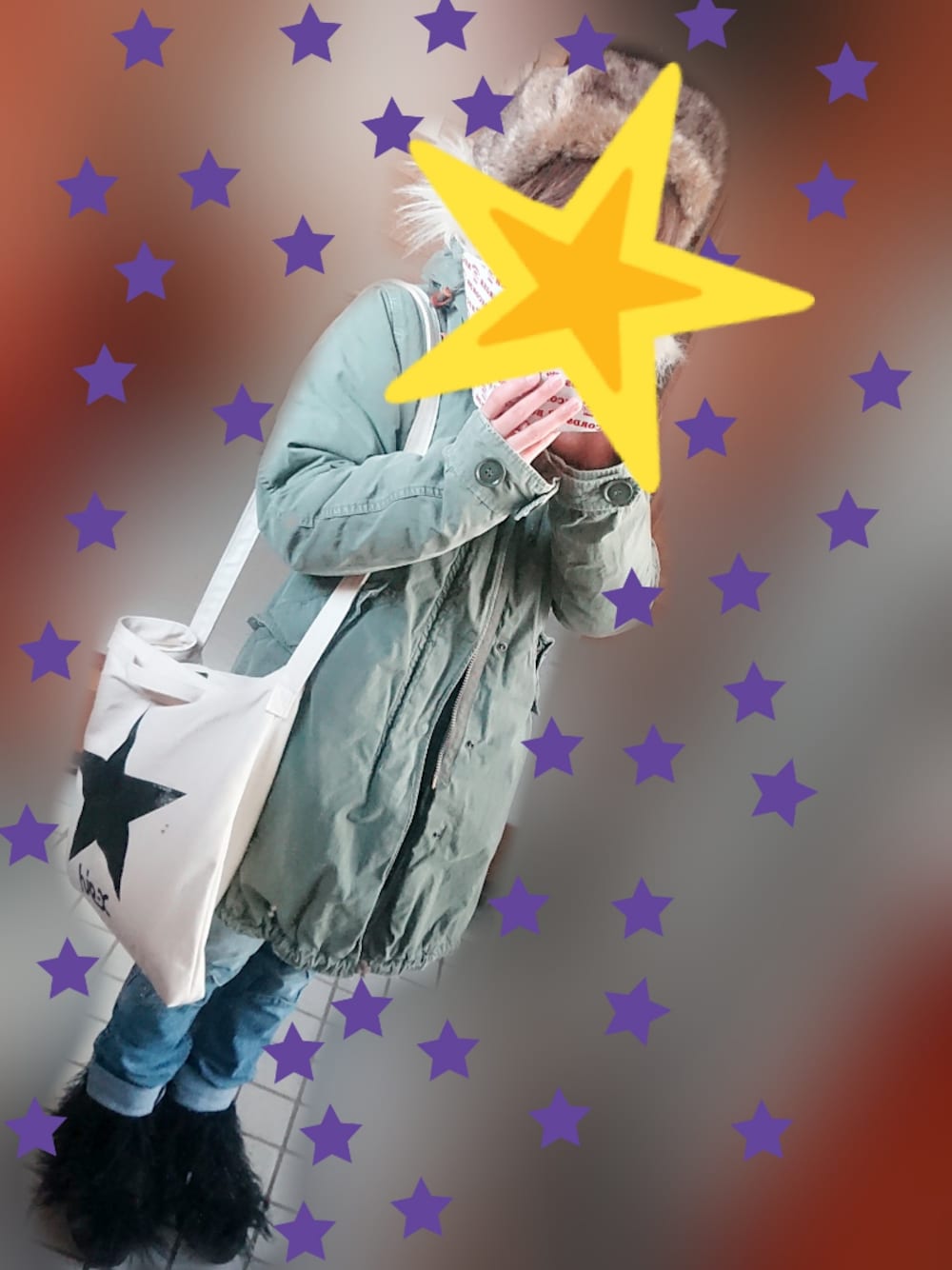冬コーデ⭐⭐ フィールドコートの首元部分をしめればマフラーいらず😳😍❗ フライトキャップにファースニーカーを合わせて防寒対策バッチリ👌 デニムとトートバックで星合わせ💓💓