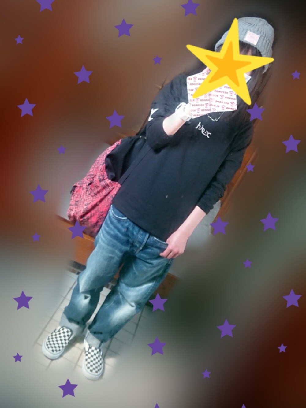ストリートコーデ⭐⭐ 腕と背中の星が可愛すぎるトップス💓😆 ダボダボデニムは、とっても個性的なデニム🎵2本のデニムを1本のデニムにリメイクしてるため、ベルトループやポケットがズレてます😁✌️ 洋服がシンプルなのでリュックやスニーカーは柄物にして、ちょっと派手にしました✨✨