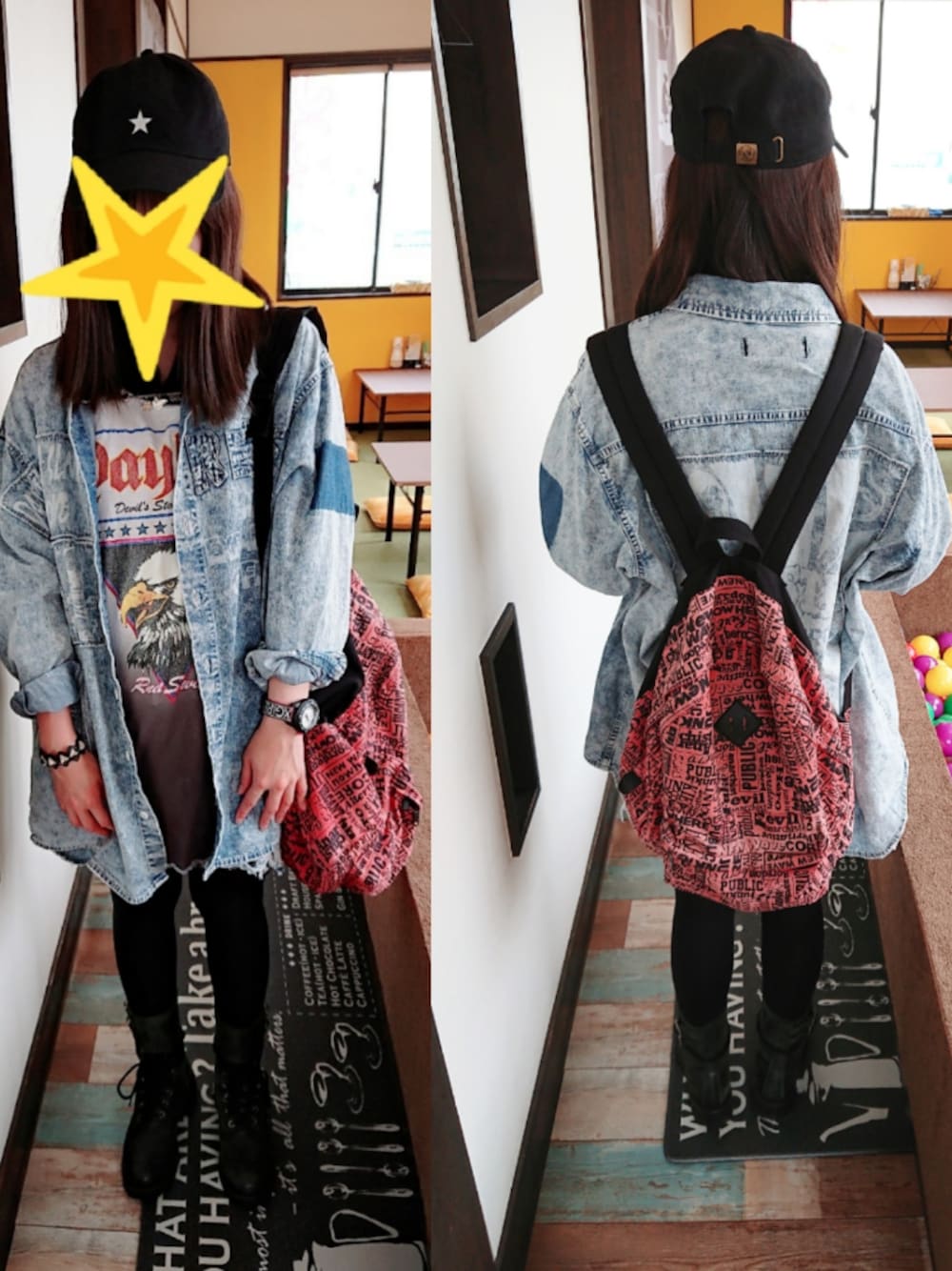 カジュアルコーデ⭐⭐ ラグランとデニムシャツワンピをレイヤード❗ このラグラン裾の方がグラデーションになってて珍しい😳💡 リュックの赤を差し色に、あとはブラックでしめました😄 シンプルな星デザインが可愛いキャップお気に入り💓💓🙈