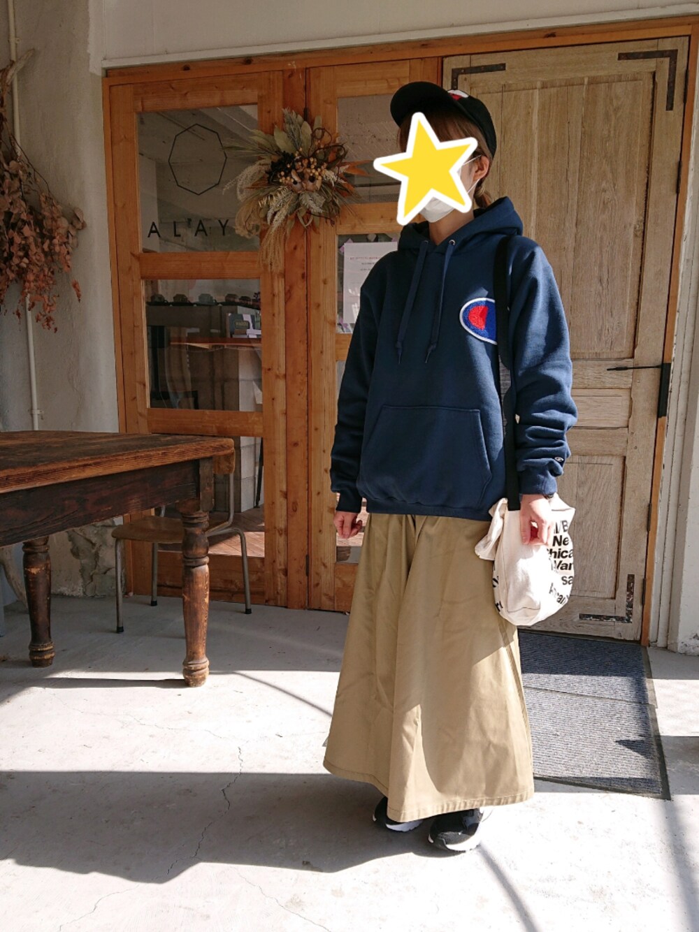ガーリーコーデ⭐⭐ 大好きな高橋愛ちゃんが着てそうなコーデを考えました💡🥰 初挑戦のベージュのロングスカート👗丈が長く履き慣れてないため何回か踏んでしまいました💦💔🥺😭 ベージュと相性の良いネイビーのパーカーはチャンピオンマークがワンポイントで可愛い♥️ 靴とキャップは同系色の黒でまとめてみました❗