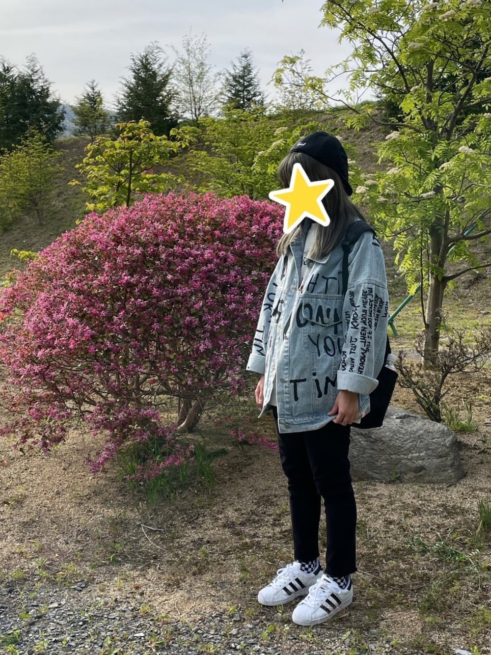 デニムコーデ⭐️⭐️ 刺繍ロゴがポイントのビックGジャンが主役のコーデ😊💗 デニムGジャンがインパクトあるので他のアイテムは白黒でシンプルにしました🌷 春はGジャン着たくなる🎵