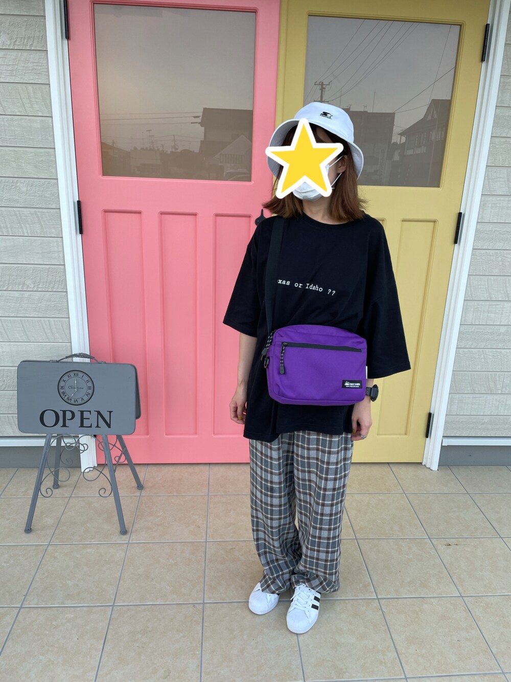 楽ちんコーデ⭐️⭐️ ダボダボTにチェックパンツで動きやすく💡上下とも憧れてるインスタグラマーさんのブランド🥰💗 バケハ、スニーカー、ショルダーでスポーティーに🏃♂️