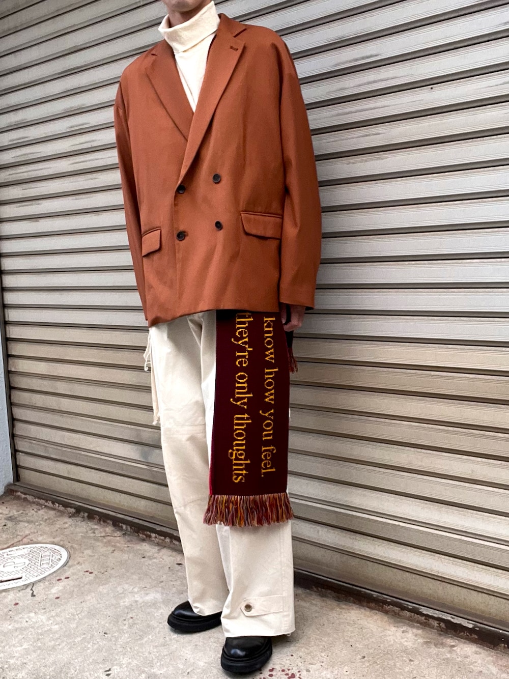 マフラーをアクセントにしたツートーンのスタイリング◎