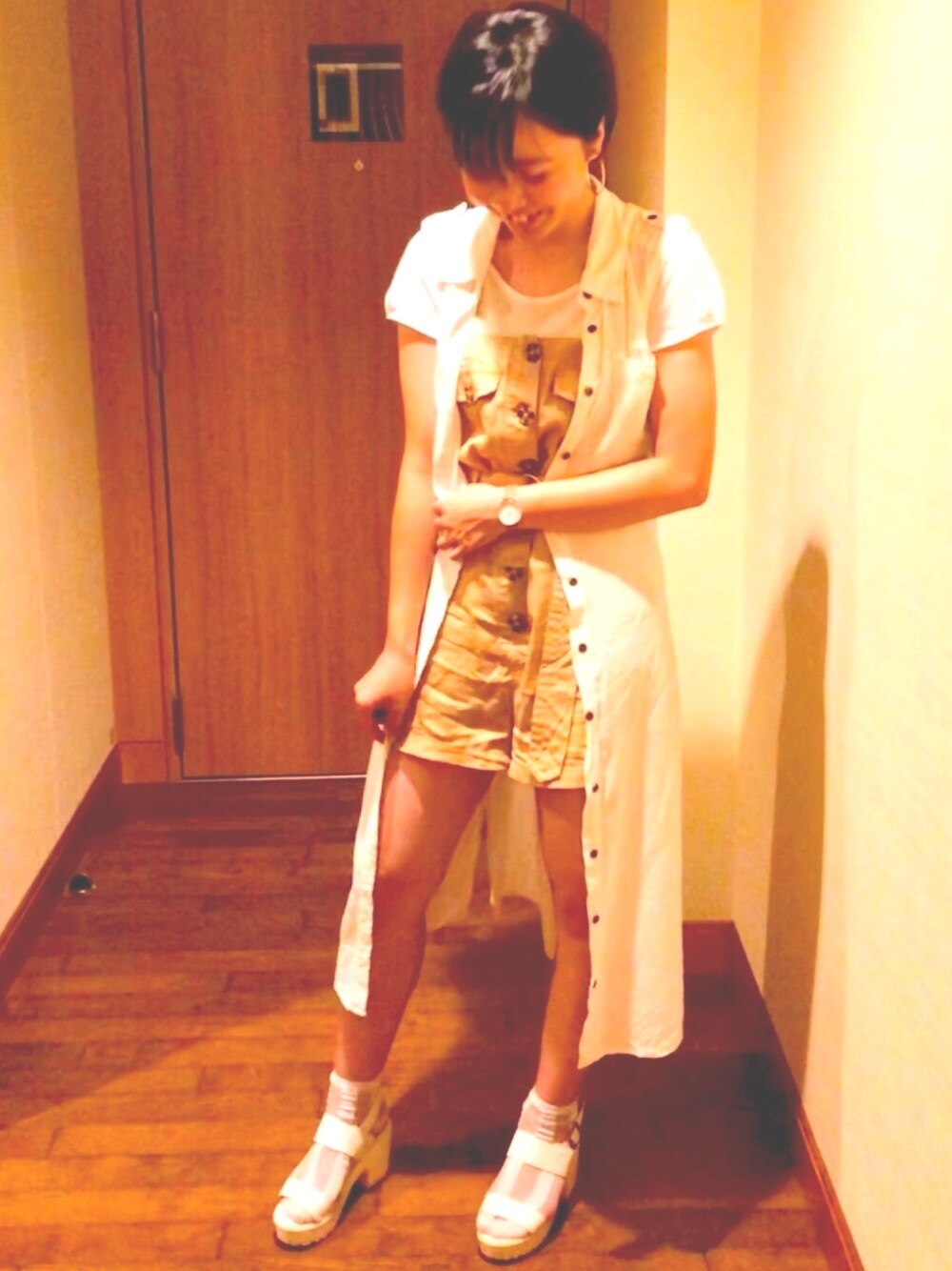 夏っぽく シャツワンピを羽織るスタイル 白×ベージュ