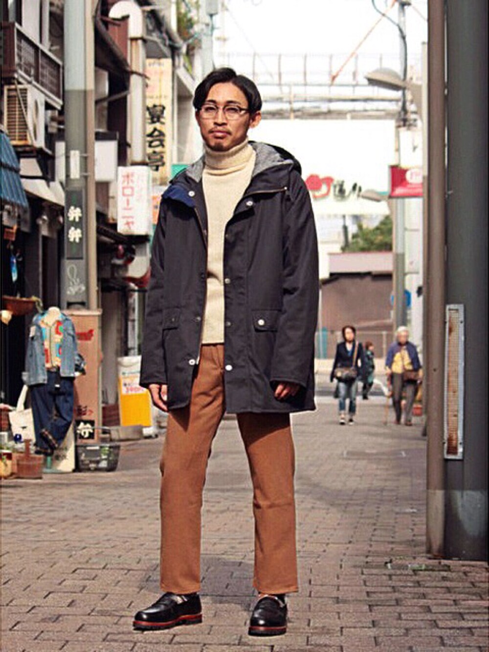 LAMONDのミリトラコートをタートルネックニットとベージュのウールパンツで大人スタイル
