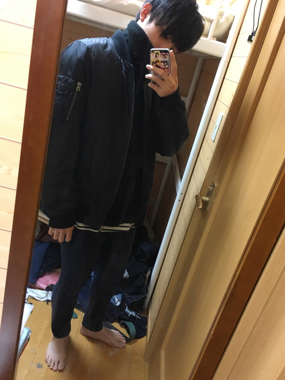 裸足ですみません 黒を基調としたコーデです。 黒だけだと寂しいのでシマシマのレイヤードアイテムも入れました! くつはなんでもあうとおもいます!