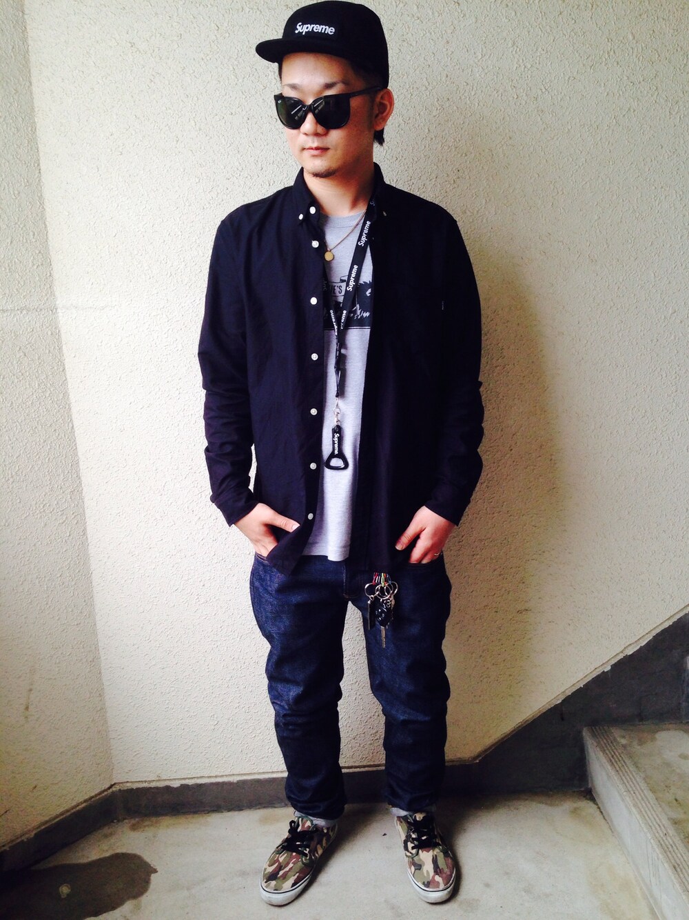雨ですねー。 ラフなスタイル。 シャツ:Supreme Tシャツ:Supreme デニム:A.P.C シューズ:Vans キャップ:Supreme