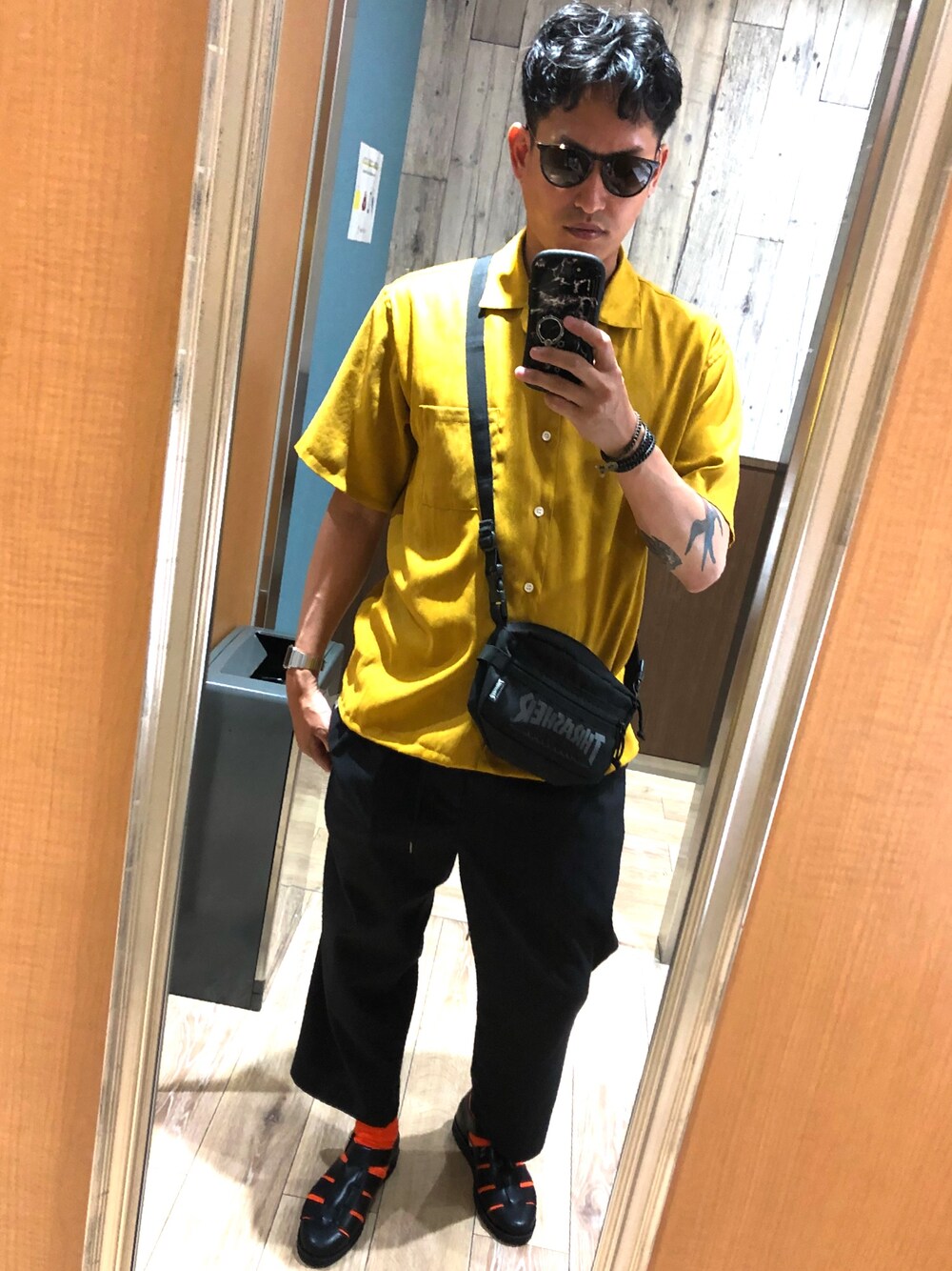 福岡から神戸へ移動中💫 カメラマン不在のためミラー自撮りで見にくくてすみません。 アイテムはこれまでアップした物の着まわしコーデになります💫 今期はオープンカラーシャツ大活躍!体温調整しやすいです🖤