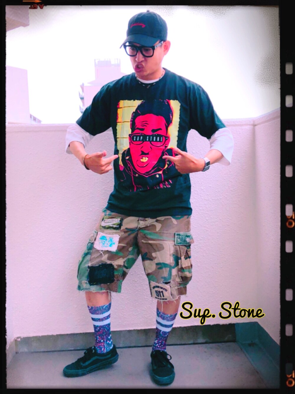 Sup.StoneオリジナルTシャツ出来ました💫どこで売ってるという訳でもないですが、Snapteeアプリ内で購入可能です😂 プリントのモデルはもちろん私😂 気になる方は是非コメントお願いします🖤 今回ストリートテイストで合わせてみました!元々スケーターな僕は一番得意なジャンルです♬