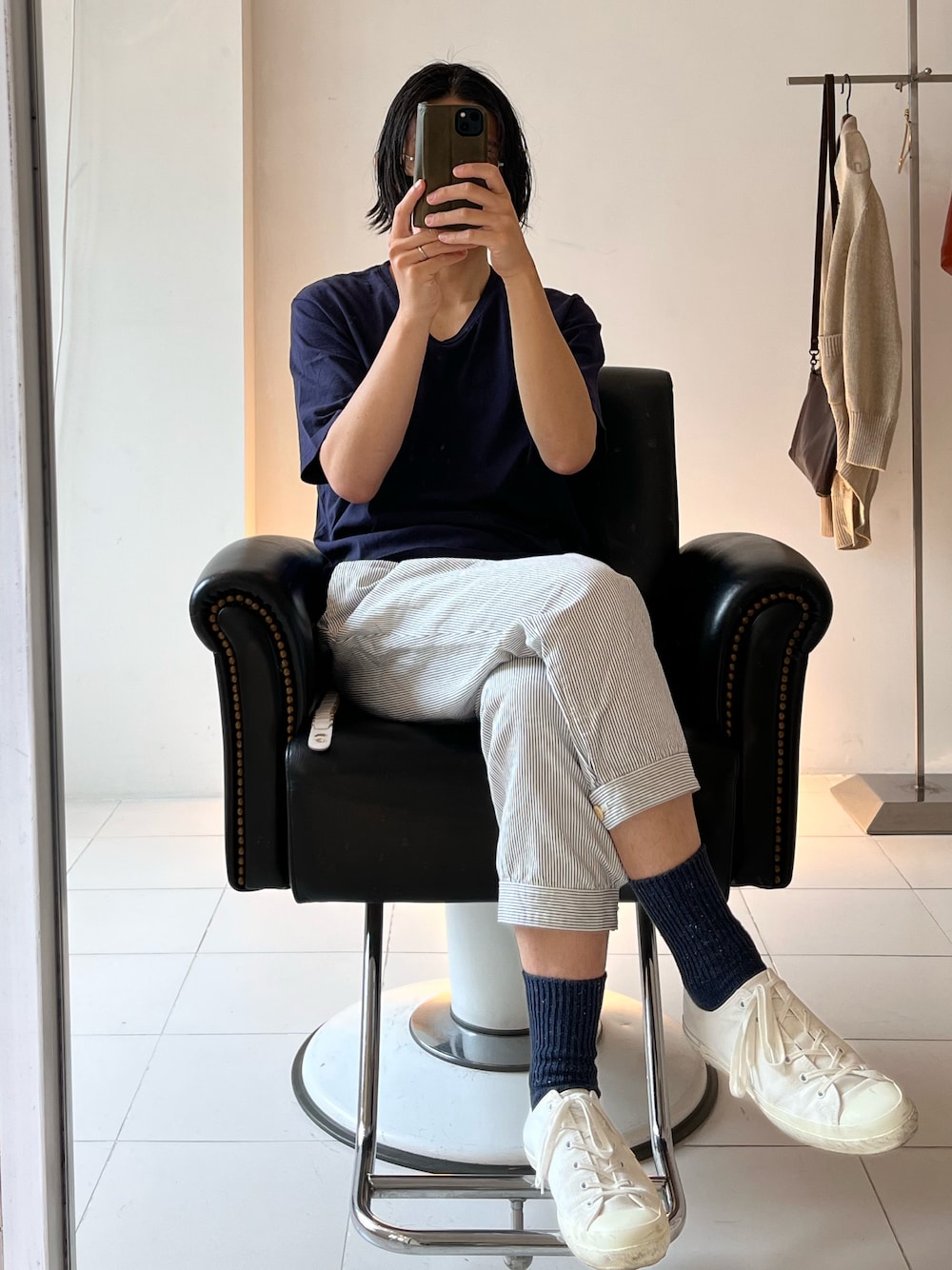 季節感の全く無い投稿。 暑い日だったので、ネイビーのカットソーにネイビーストライプのクロップドパンツ。 ベルトとスニーカーもホワイトにして少しでも涼しげに。