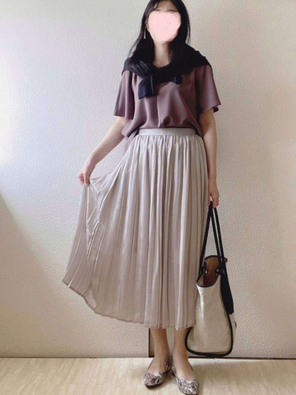 ご覧頂きありがとうございます😊 前回の投稿に「いいね」や「お気に入り」 して頂いた皆さまありがとうございます🙇♀️ 過去投稿にフォルダイン📂して頂いた aomiiさん 神出鬼没Beeさん ゆっきーさん たっくんさん ありがとうございます🥰 くすみカラーコーデ🍂 NATURAL BEAUTY BASICさんの サテンダブルクロス半袖 マッドなサテン地の定番ブラウスです🤎 one after another NICE CLAUPさんの 幅広プリーツスカート 若干光沢のあるサテン地のスカートは 揺れ感が堪らないので つい試したくなります😚 全体的に ブラウン✖️オフホワイト の大人女子コーデにしてみました✨ 日々のリアルコーデを投稿してます