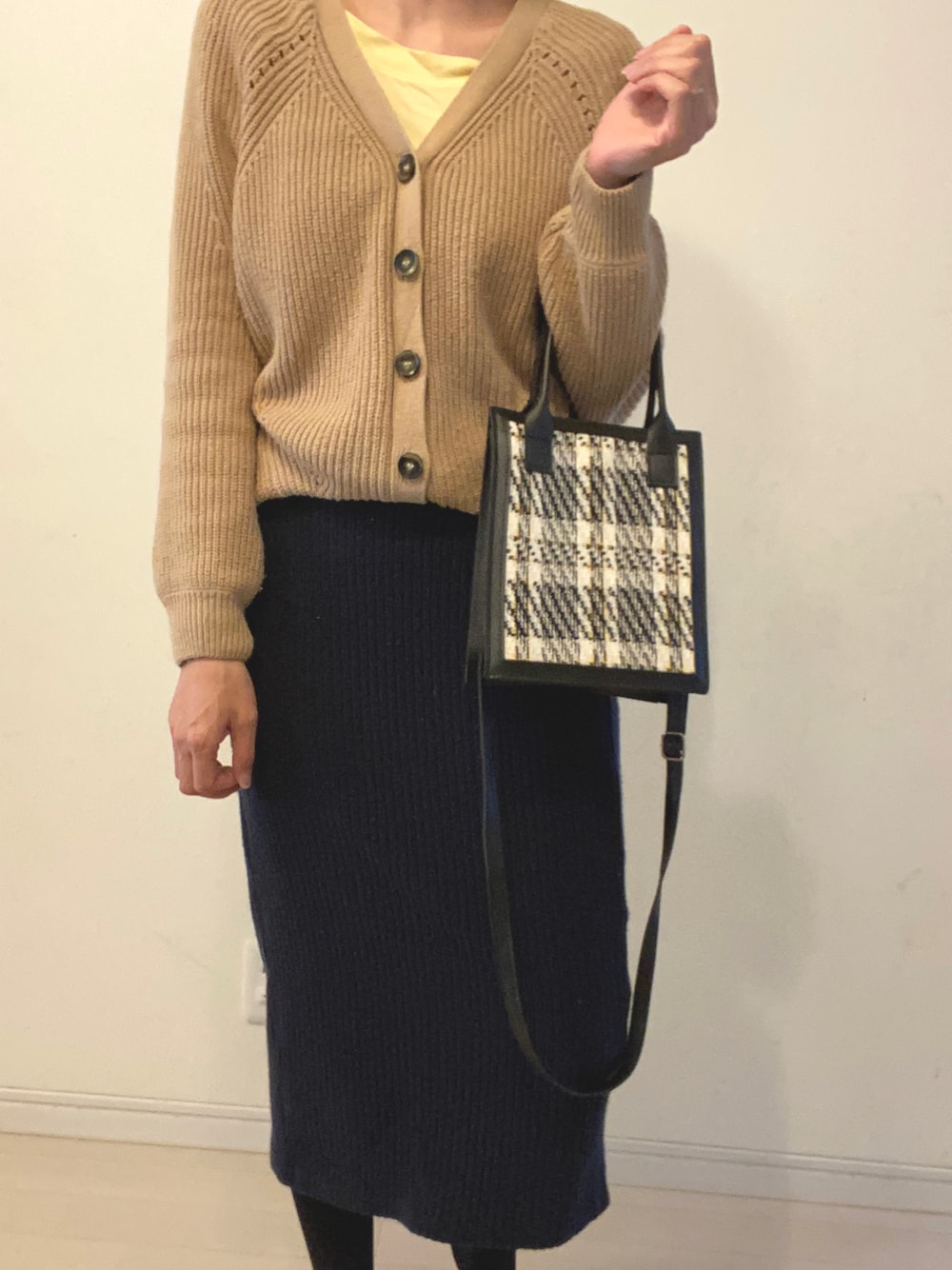 今日は、スカート☺️ 黒に見えるけど、ネイビー! 足冷えるから、まだタイツ着用(笑) インナーに、イエロートップスで春意識🌸