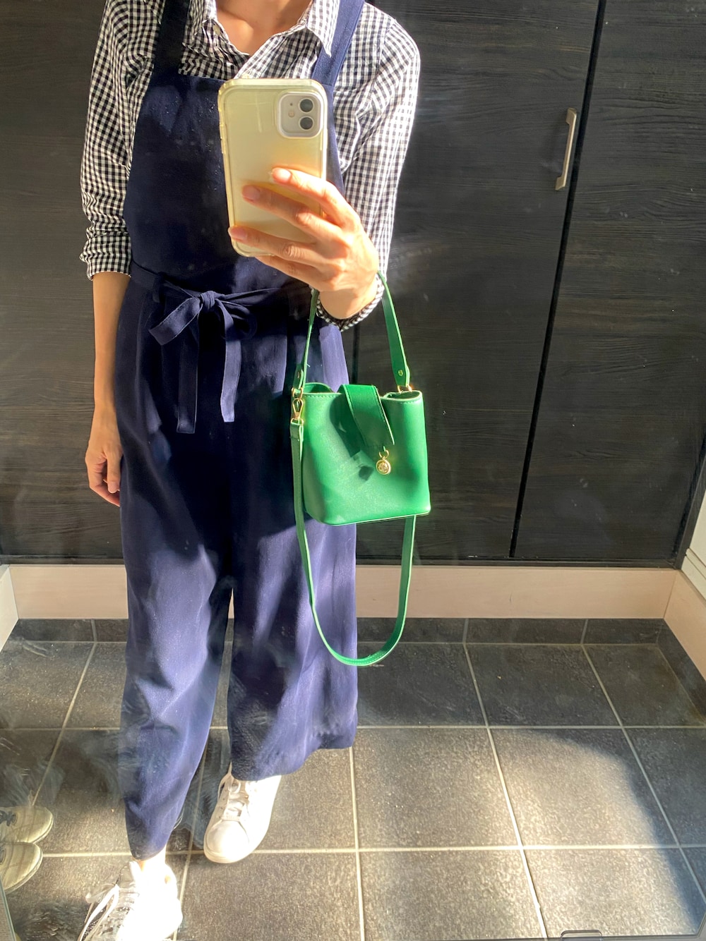 チェックシャツ×サロペットを着たよー! グリーンバッグを差し色に…😊 サロペット、らくちんやし可愛い!