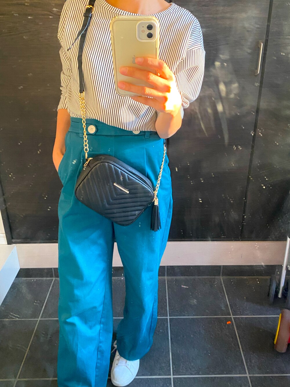 ストライプ×グリーンコーデ😊 今日は暖かかったから、七分袖! 写真は青く見えるけど、グリーンのパンツ履いたよ〜 かばんはSHIEN。めっちゃ安かったやつ。