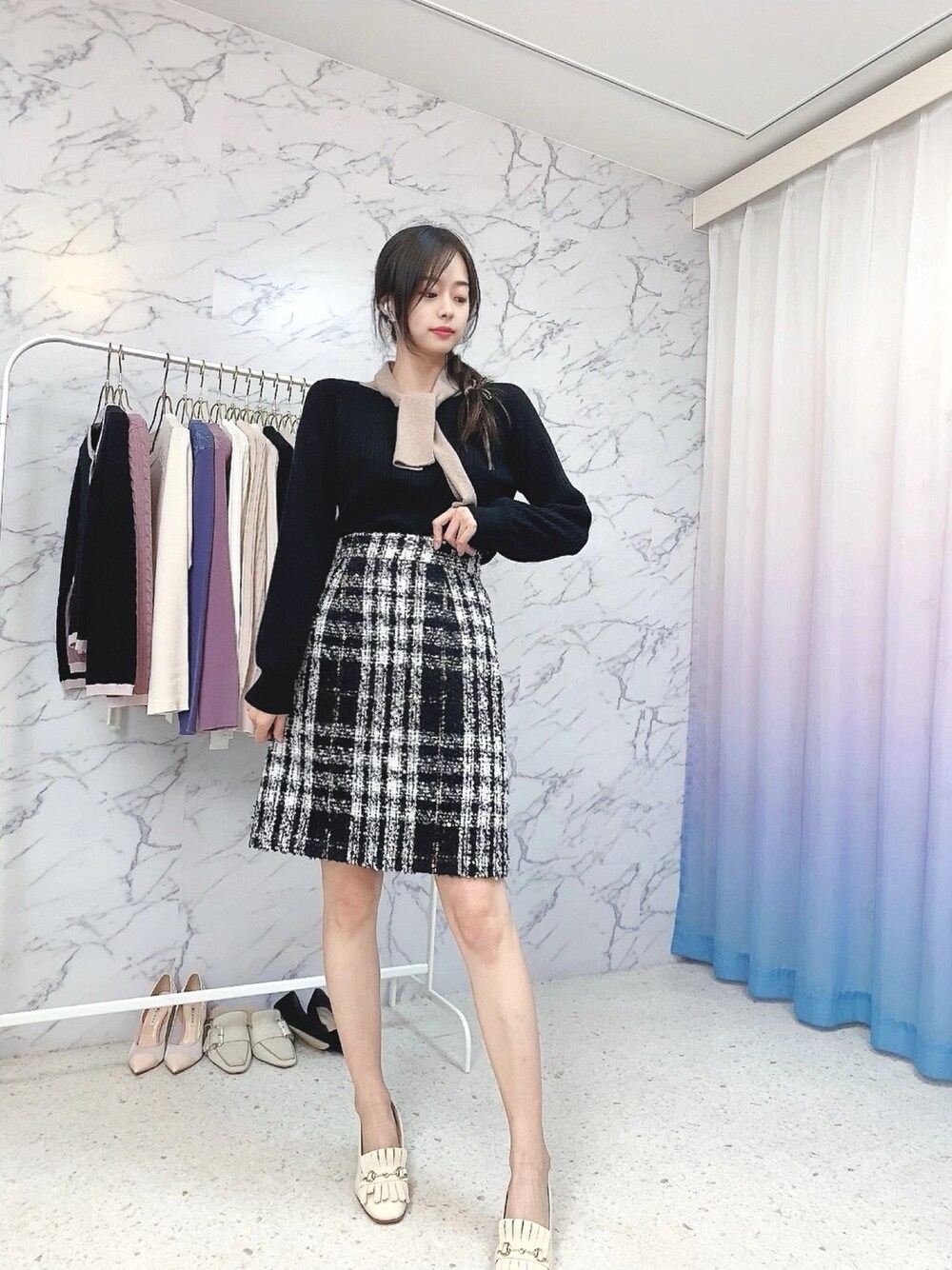【ボウタイボリュームスリーブリブニット】 クラシカルな雰囲気のボウタイ付ニットです。首元に程よいボリュームを出せるボウタイデザインが小顔を期待できます。身頃はシンプルなリブ編みですっきり着られるデザインです。ブラウスのようなディテールながらニット素材で着心地も良いです。今季トレンドのボリュームスリーブもポイントです。【スタイリング】無地はもちろん、チェック柄、総柄スカートとのキレイめコーディネートがおすすめです。 【チェックツイードミニスカート】 冬にぴったりなチェックツイード素材のミニスカートです。短すぎない絶妙なミニ丈ですっきりとしてレッグラインを演出します。ウエストベルト部分を太目に切り替えてるのでトップスインもすっきり決まります。※後ろウエストはファスナー付き・裏地付き【スタイリング】ニットをイン、前だけタックインしてすっきり着るのがおすすめです。