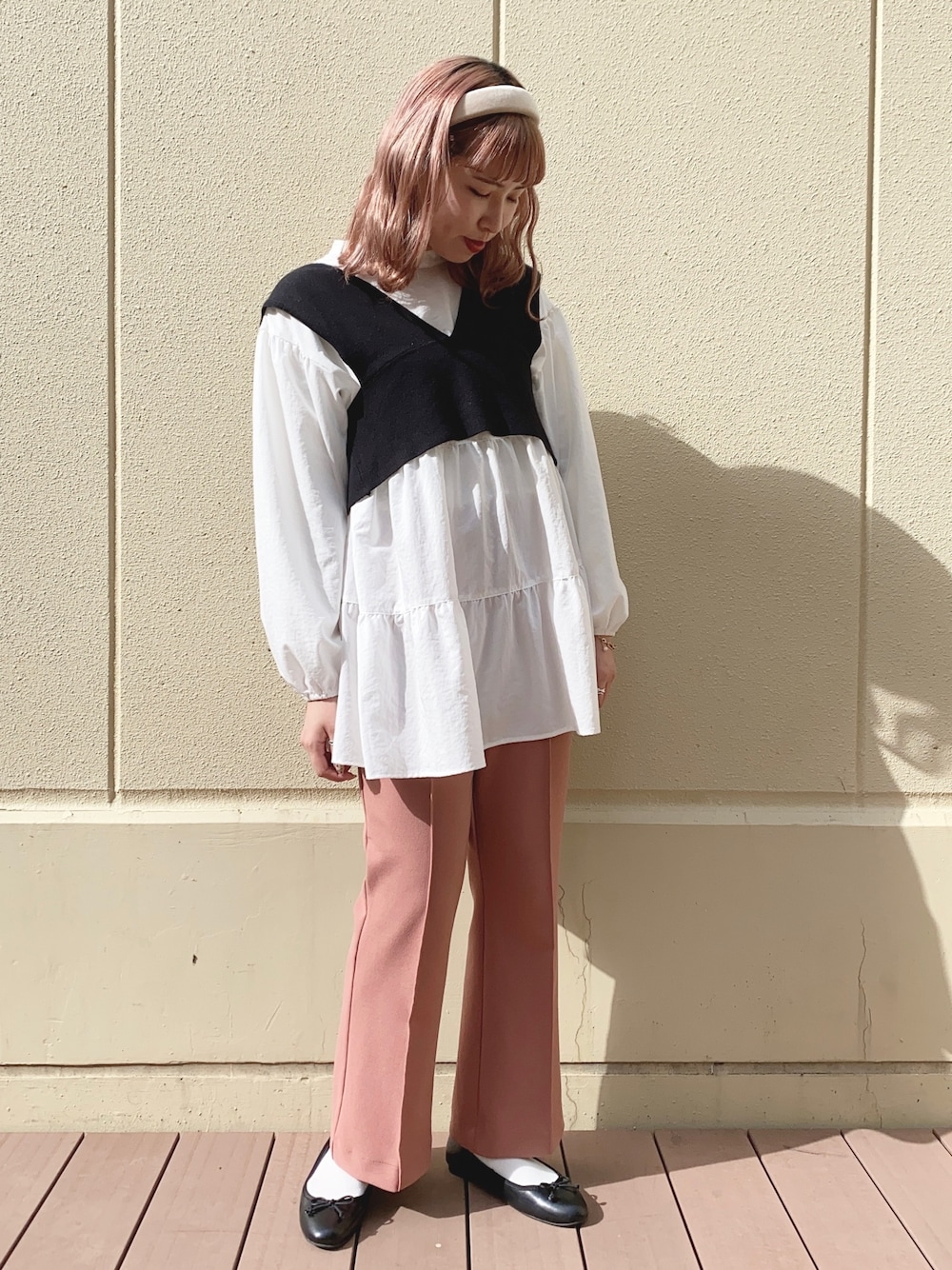 休日コーデ🧸 GreenParksのセレクトアイテムのブラウスは、 ティアードになっているので1枚で着てもシルエットが 可愛らしいです🥰 こちらのカラーパンツはearthで人気のアイテム👗 ストレッチが効いているので楽にお召しいただけます✨