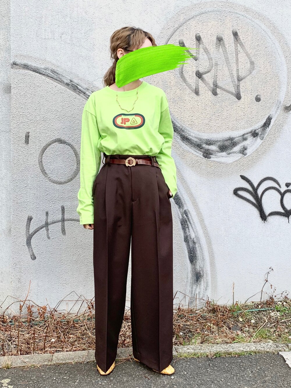 お仕事コーデ 🐉 ショップの着用コーデ撮影 きれいめなパンプスとパンツに あえて派手なカラーロンTで外し︎︎︎︎✌︎✌︎✌︎