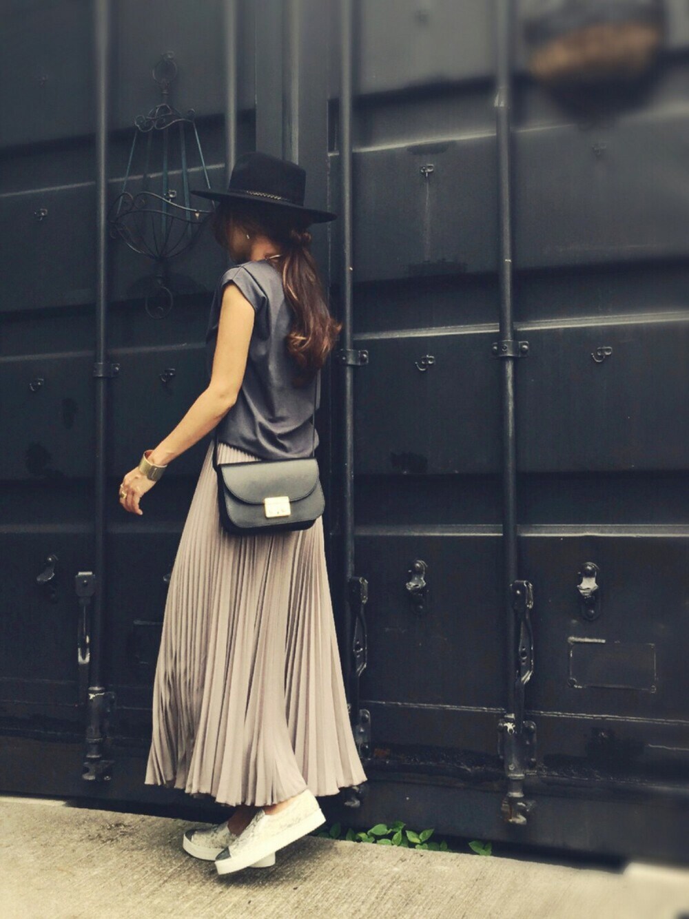 こんばんは🌛 いつも見て下さり ありがとうございます🙏😊 朝晩は随分涼しくなりましたね〜🍂 この季節の変わりめ時期は ついついカーキとグレーに頼りがち…😓 というとこで、 今日はグレーグラデコーデ☆ 軽やかな揺れ感が決め手のロングスカンツ💜 動きの出やすいアコーディオンプリーツで 重たく見せず、 更にはパンツだから気負わず穿ける🎵 涼しくなったらレザーライダースとか羽織ったり〜〜😙