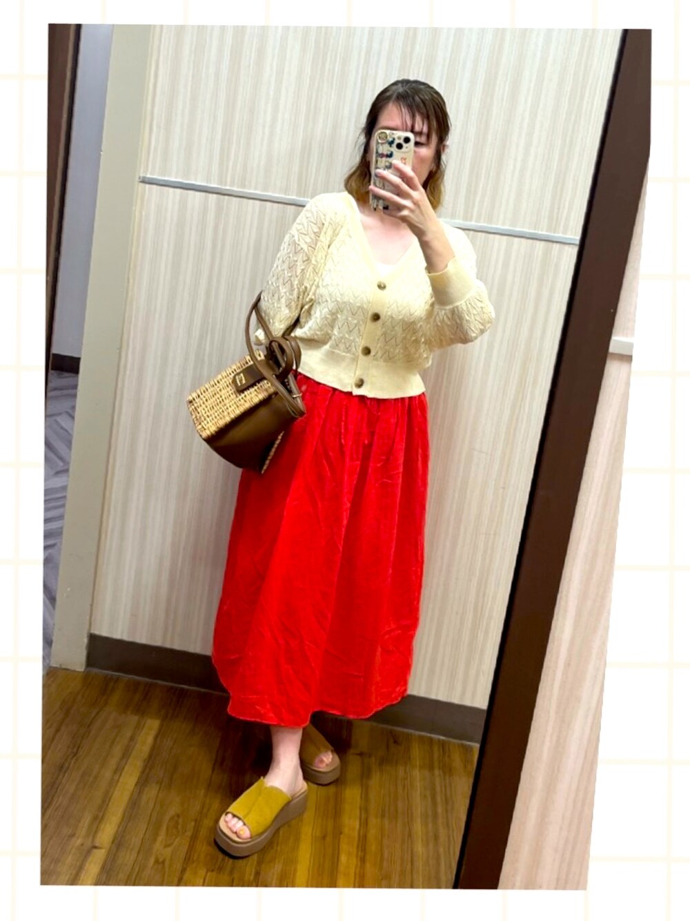 今日は映画館へ BADBOYS観てきました! 綺麗な朱色のスカートに、個性的なデザインのかごバッグをアクセントに。 すこーし肌寒かったので、クリーム色の透け感のあるカーディガンをチョイス。 サンダルは、カーディガンに合わせてイエロー系でまとめて。
