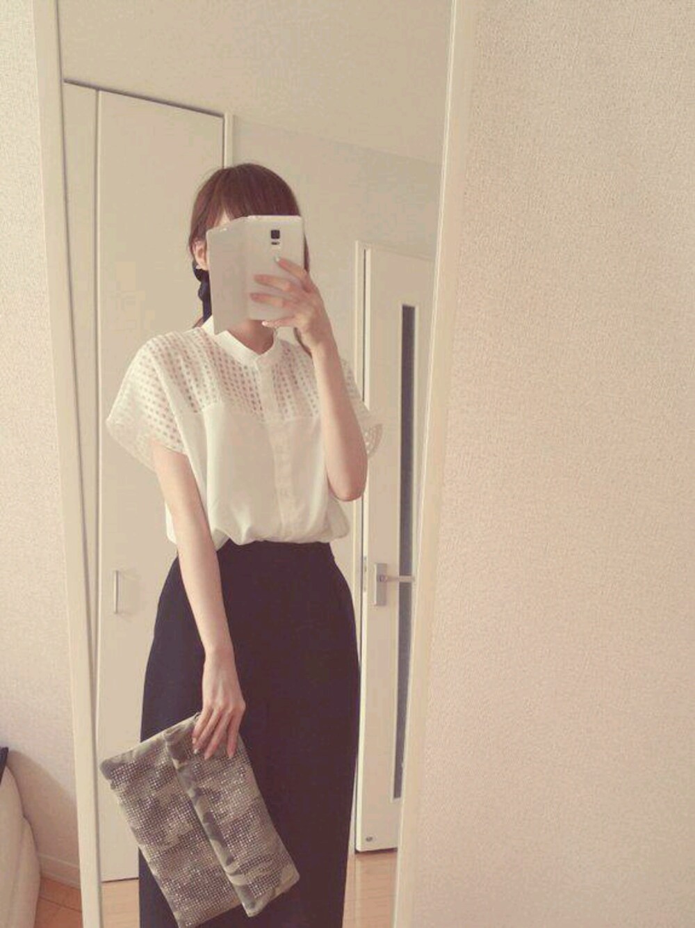 ワイドパンツとブラウスでシンプルに。スタッズのクラッチバックを持って。