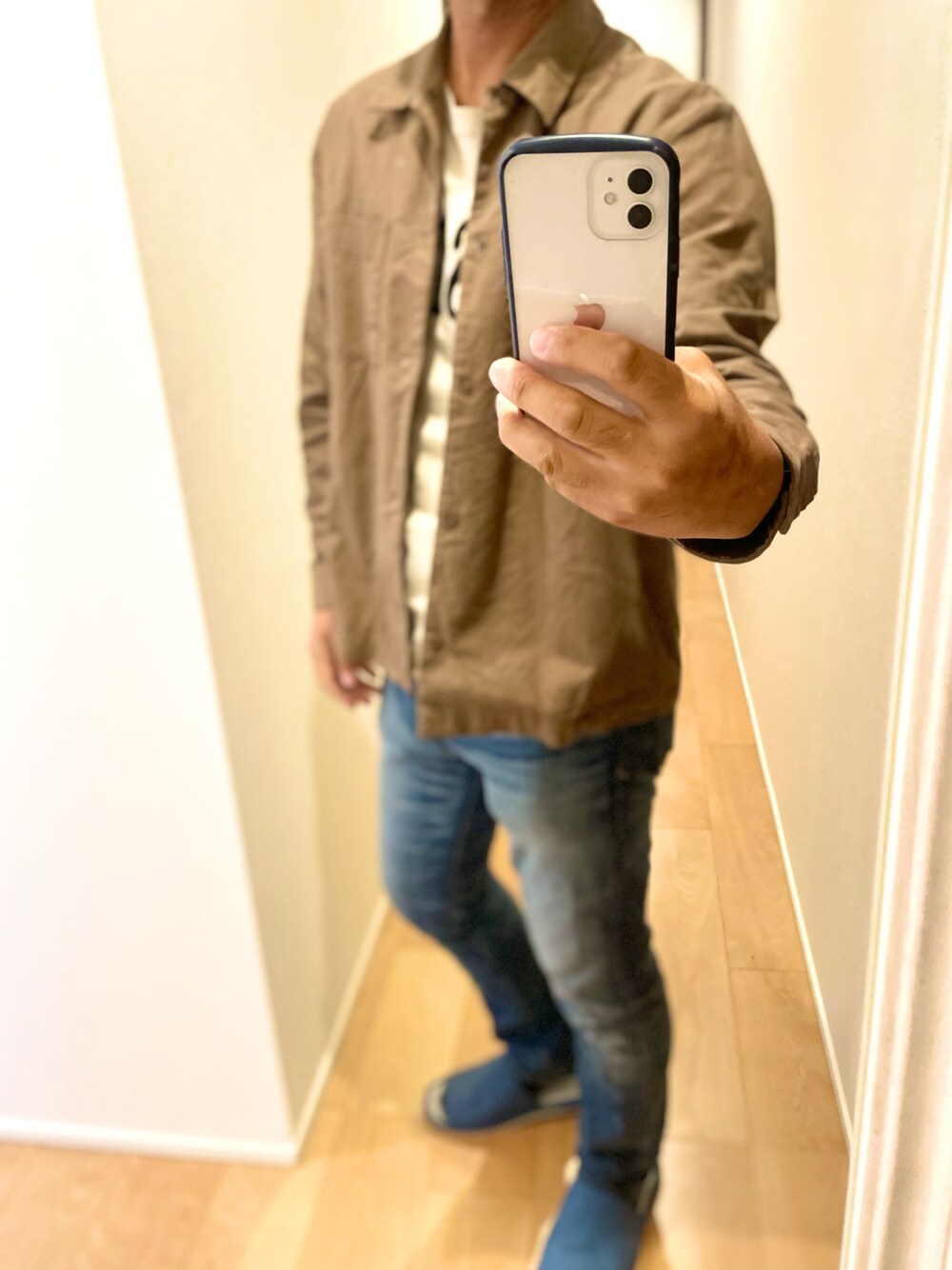インナーのベージュのTシャツはUNIQLO ベージュブラウンのシャツは無印良品。 デニムはLEVI'S