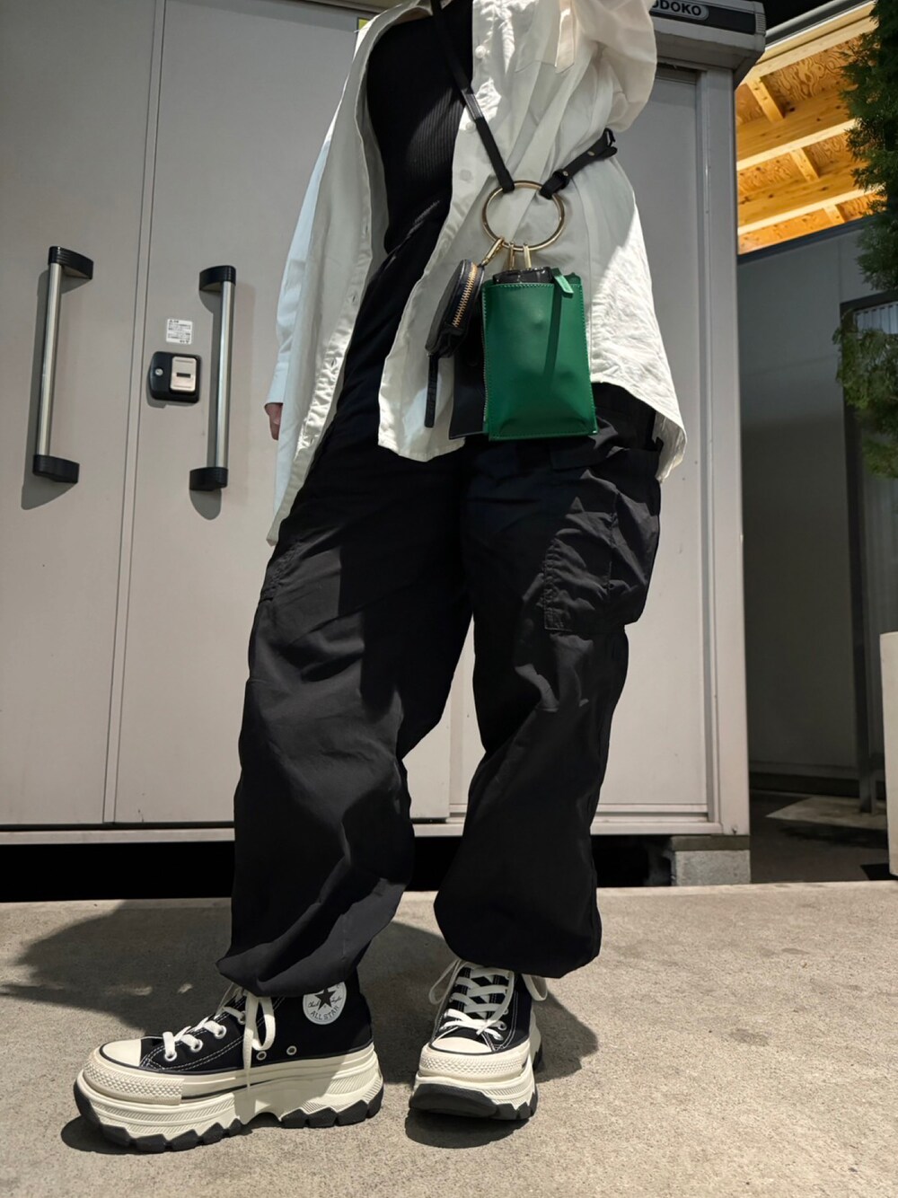 ブラック系のカーゴパンツ、ブラック系のスニーカー、ブラック系のタンクトップを着用したレディースの秋コーディネートの1枚目の写真