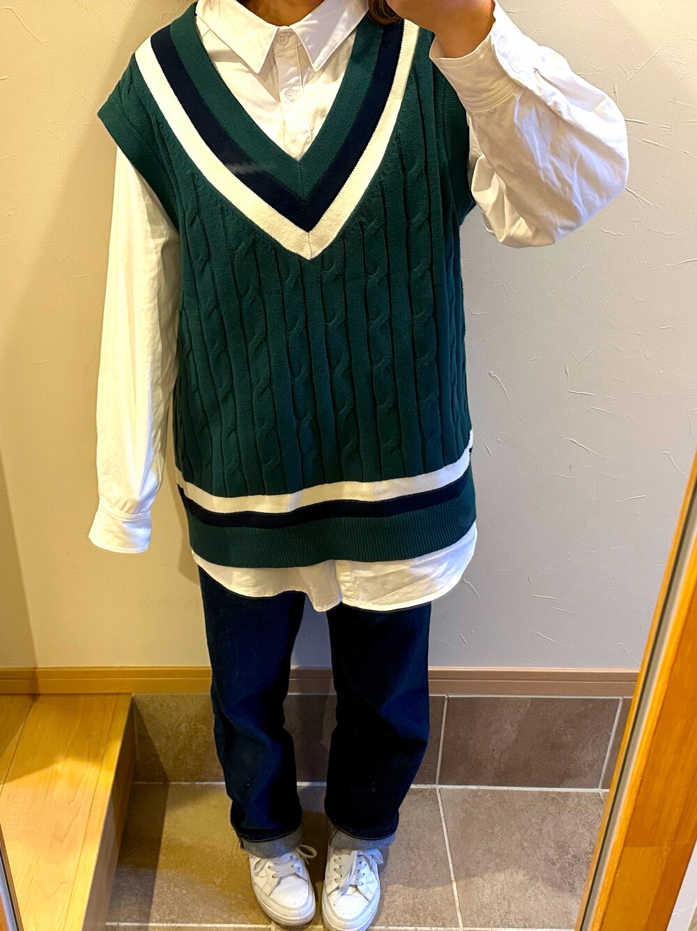 お気に入りのベスト〜 この上に黒のダウン着てお出かけ〜 雪がなくて最高。