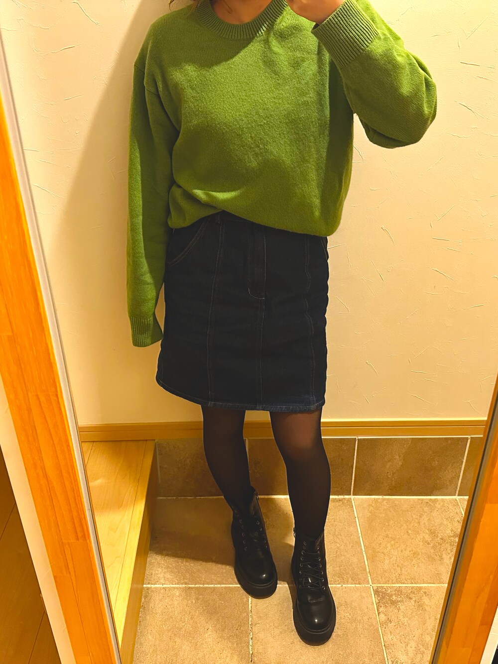 グリーン系のニット/セーターを着用したレディースの冬コーディネートの1枚目の写真