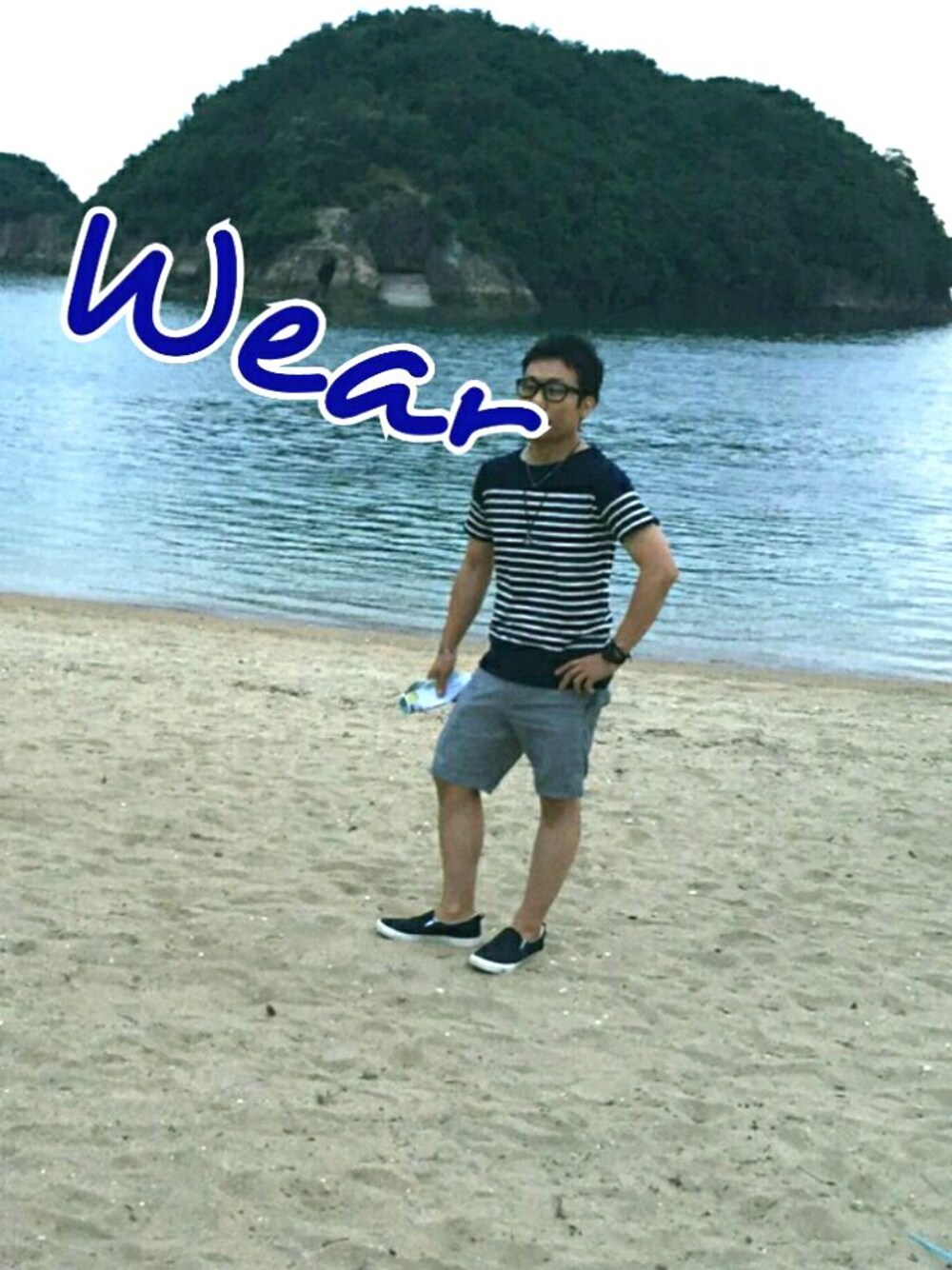 紺色ボーダー ショートパンツ 伊達メガネコーデ