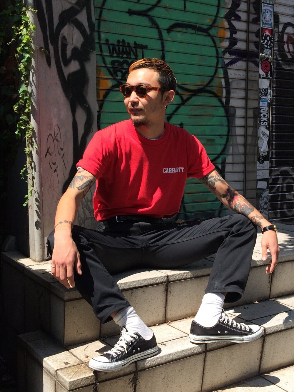 シンプルなブラックカラーのパンツにインパクトのあるレッドカラーのCollege Scriptを袖をロールアップしてコーディネートしました。 Tシャツは定番物でカラーも豊富にあるのでオススメです! 是非店頭にも遊びに来て下さい!