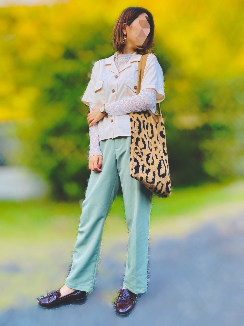 見て頂きありがとうございます☺️✨ トップスとパンツが 淡い色味なので 時計、バッグ、ローファーを 茶色にして統一感と アクセントplus💓
