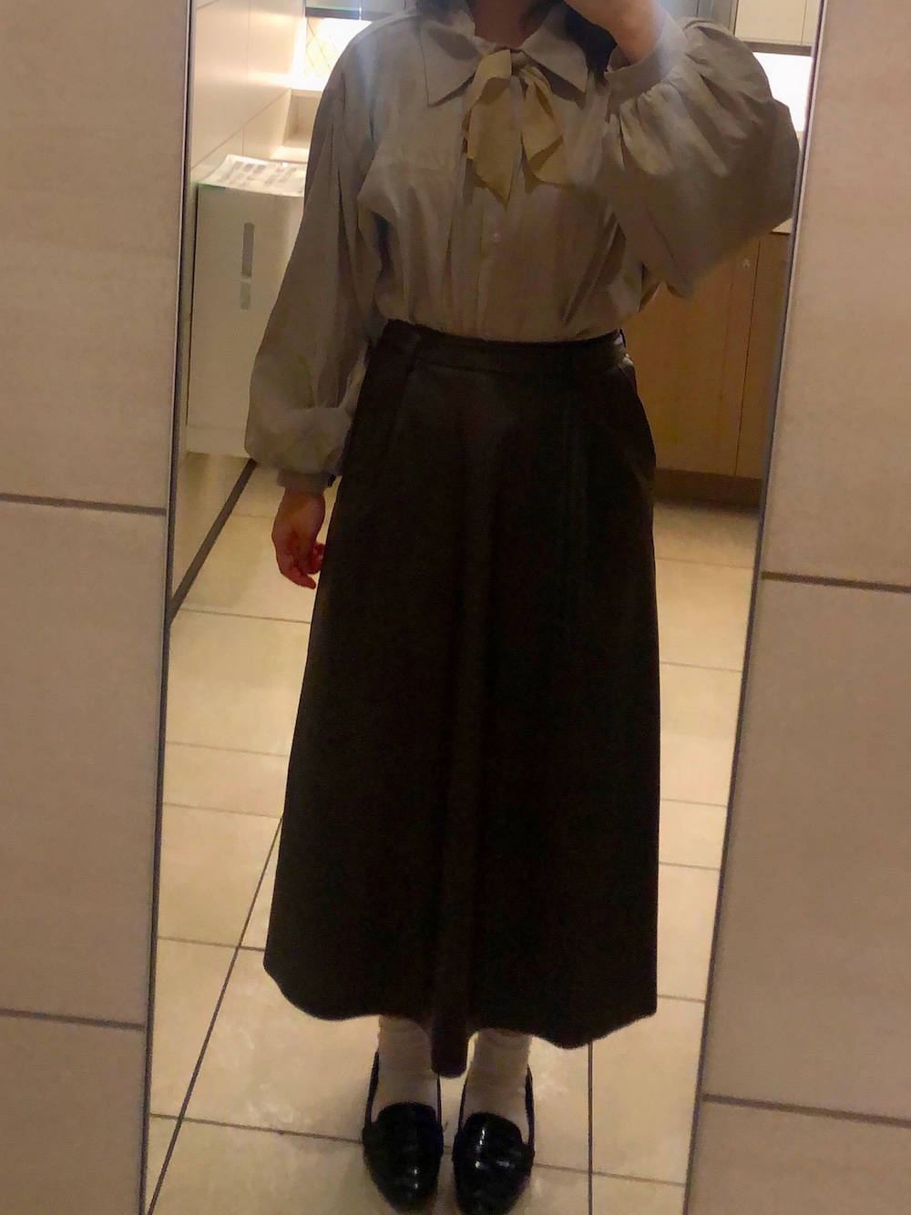 衿元かちょっと大きくて緩いから スカーフで締まり良く見えるように。