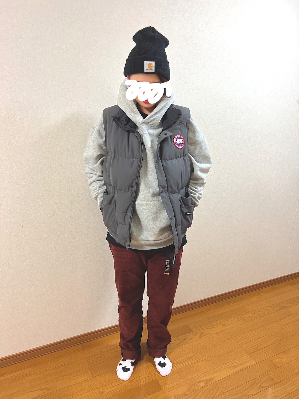 グレーのメンズパーカーにダウンベストを合わせました💛 パンツはコーデュロイ生地でお気に入り❤️