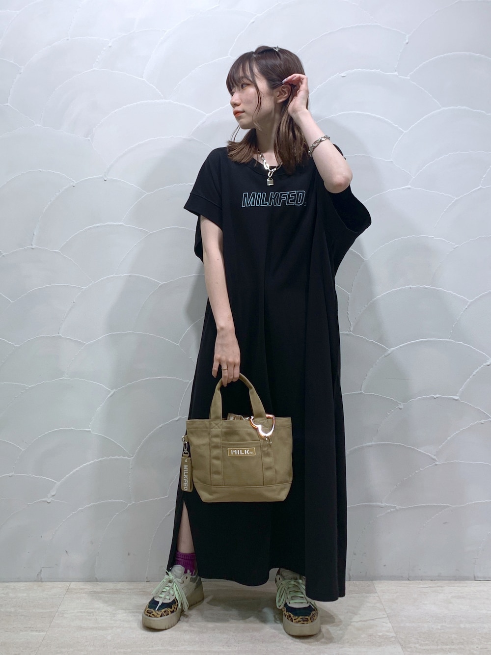 楽ちんワンピースコーデ😋🖤 どの年代でも着やすいワンピースになっています🎶 後ろには大きなバックプリントがありワンポイントにもなり写真映えするワンピースでもあります🤍 ギンガムチェックの巾着がセットになったミニトート♡ 可愛すぎて私も買いました😂💕 🤍🛼Instagram⇒@suzu_mf🛼🤍