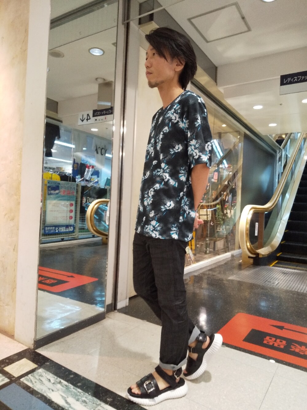 こんにちは。トルネードマート吉祥寺パルコ店の鈴木です。 どーもです。 今回は「たまには目立ちたい大人」 をテーマに。 シンプルな画像を投稿してても閲覧数が伸び悩んでいるんでね。 柄物着ておけば目立つかと思いましてね。 ただ、明るいカラーでやるのはちょっと恥じらいましてね。 結果、今回も伸び悩むと予測。 カットソー 631-1178012 パンツ 631-0117402 サンダル 631-1166006