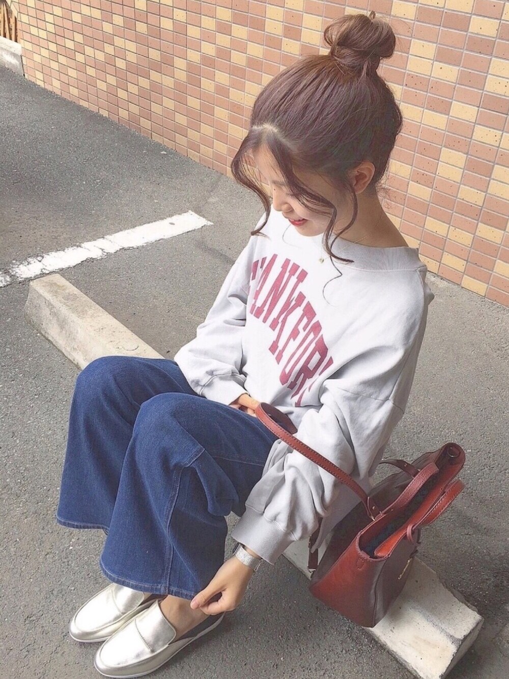 ロゴスウェットにワイドデニムの ゆるいコーデ👖 足元もスリッポンミュールで楽ちんな日🐼 アクセサリーと時計は、小窓にアップ載せてあります!