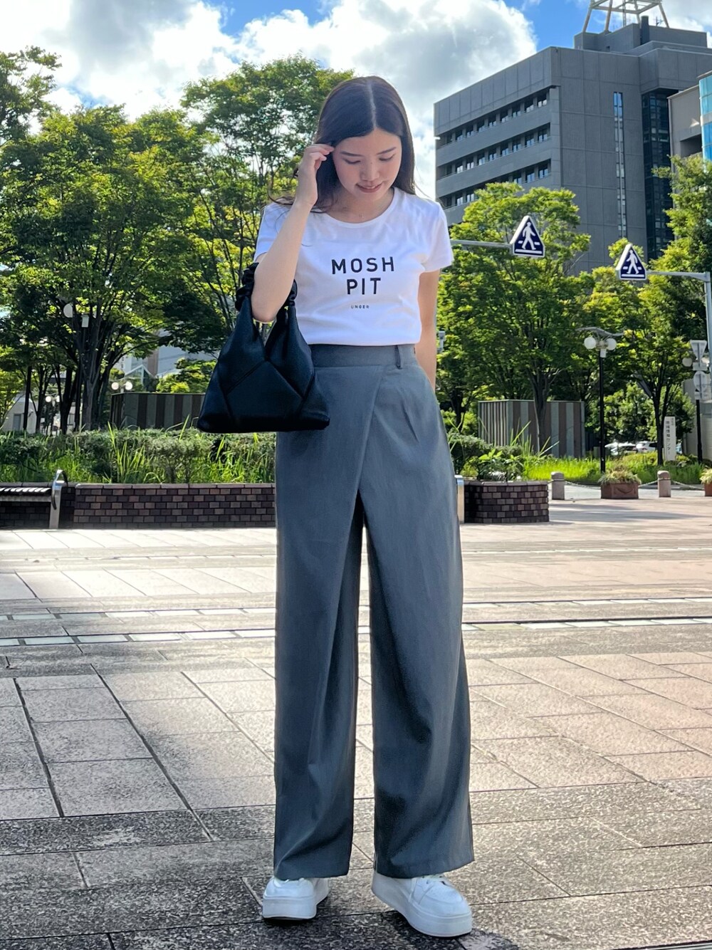 ずんのスラックス「重ねタックパンツ」を使ったコーディネート