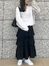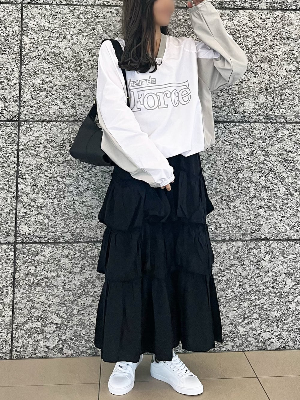 モノトーンのスポーツミックスコーデ 可愛くなりすぎないように、ナイロンのロゴトップスでカジュアルダウンしたよー 🏷️un+frame print logo nylon pullover/プリントロゴゲームシャツナイロンプルオーバー color:ホワイト 柔らかシャカシャカなプルオーバー 雨の日のお出かけとかスポーツする時に着たらめっちゃかわいいと思う 🏷️CLEA Iラインギャザーティアードロングスカート color:ブラック ティアードで甘めなんだけどIラインなのが良き❤︎大人カジュアルにもってこいなスカート 🏷️un+frame round moon shoulder bag/ワンハンドルラウンドムーンPUショルダーバッグ color:ブラック キレイめにも活躍してくれる三日月型のバッグ コンパクトなのに 500mlペットボトルも入り、しっかり収納力もある優秀さん 🏷️POLO CHAMPS ポロチャンプス 別注 ワンポイント刺繍 コートスニーカー color:グレイッシュベージュ グレイッシュベージュのロゴがポイントになってる白スニーカー👟 グレイッシュベージュがもう本当に可愛いのよ