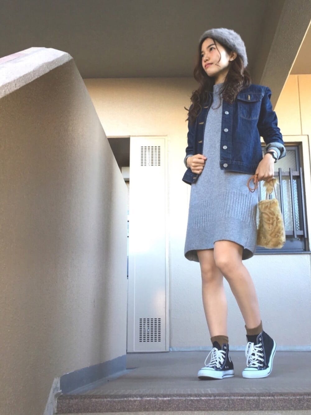 こんにちは! 今日は良いお天気☀️ 先日、+黒シャツ、ベレー帽 でキレイめに合わせた グレーのニットワンピ を、今日は +Gジャン、ふわふわベレー帽、コンバース 合わせで、カジュアルに着てみました😎 キレイな形のシンプルなニットワンピなので、色んな着回しが出来ると思います! 今ならなんと 60%OFFの ¥1,724- ✨✨お買い得すぎる😁 グレーは完売してしまったみたいですが、ホワイトとレッドがありました! 今日もご覧頂き、ありがとうございました🙇