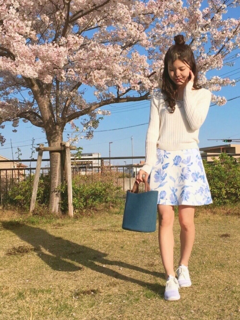 MERCURYDUO さんのスカートは、綺麗な形で、ブルーの花柄が爽やかで綺麗なお色です!スカートを主役に考えたので、白いVネックのリブニットとシンプルに合わせました😊 足元はスニーカーでカジュアルに👟 今日は、満開の桜の下で撮りました🌸🌸🌸 でも写真が下手で、ピントがどっちにも合っていないという…😰スミマセン💦