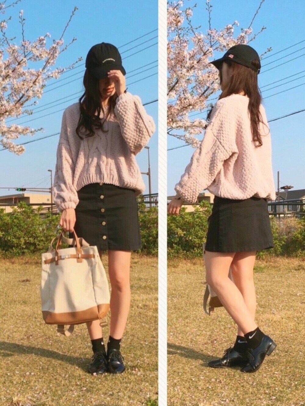 今日も桜の木の下で〜♪♫ GYDAさんのゆるニット💕シルエットも可愛いんですけど、肌触りがいいんです👍着ていて気持ちいいーニットです✨お色はピンクに見えますが、ベージュです EVRISさんの台形スカートと💕フロントボタンがトレンド感ー ストレッチが効いていて履きやすいです👌 キャップ、NIKEソックス(←ポイント)、おじ靴を黒でまとめました! 今日も見て頂いてありがとうございました💕