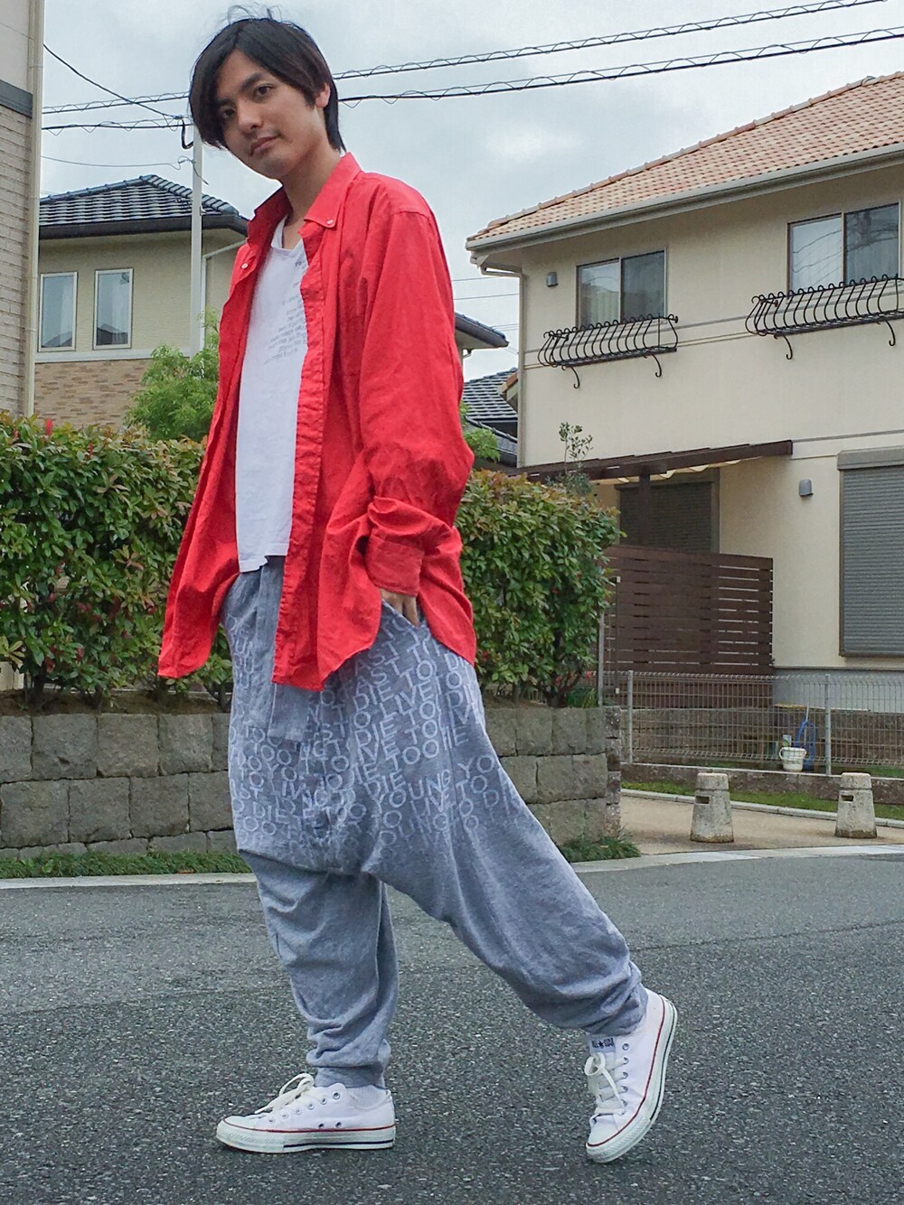 まだまだ続きます、サルエルパンツ( ̄▽ ̄) 今回はテンション上げたかったのでオーバーサイズ赤シャツと組み合わせで全体をゆったりコーデヾ( ̄ー ̄ )ノ” Tシャツもゆったりしたアイテムですが、高校から来てたらそりゃゆるいアイテムになりますよね(笑) まぁ結果オーライです(笑)
