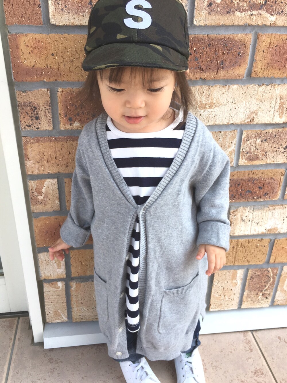 シンプル♡無印ボーダーTワンピ×ロングカーデ×スキデニ×スタンスミス 風邪っぴきで痰からんでガラガラちゃん…☻ 早く良くなりますよーに♡ ママコーデ♡coenUSAコットンボーダーT×ニコアンドロングカーデ×ワイドデニ×スタンスミス♡