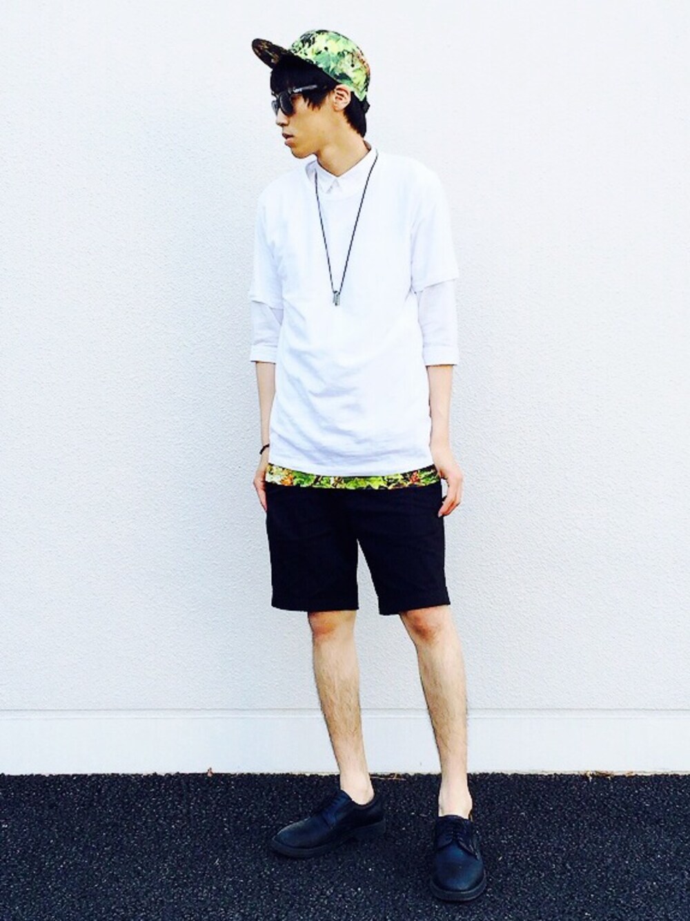 今流行りのボタニカル柄のキャップ×シャツ。 柄が派手すぎるので最小限に抑えました(笑)