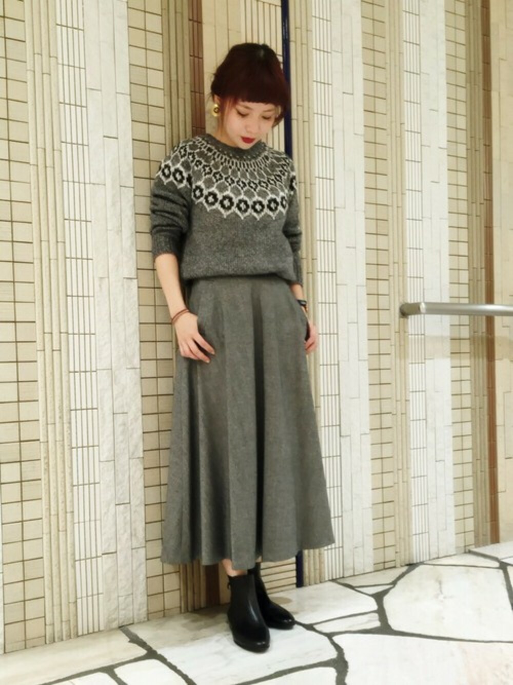 トレンドのノルディック柄ニットを同じトーンのロングサーキュラースカートと合わせることでまとまった大人らしい着こなしに。 足元はすっきり見せるために少し素肌を出しローヒールのショートブーツを合わせました。