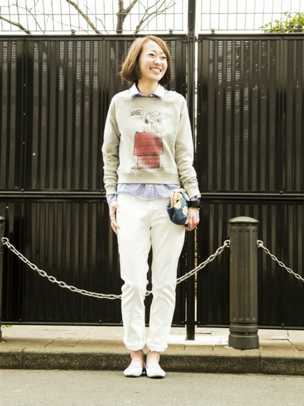 澤田 実奈(レイ ビームス 池袋) スヌーピーがプリントされた遊び心のあるスウェットに、ベーシックなシャツやホワイトデニムを合わせた大人のカジュアルスタイリング。 鮮やかなブルーのクラッチバッグや、ストライプのオペラシューズでとことん爽やかに!