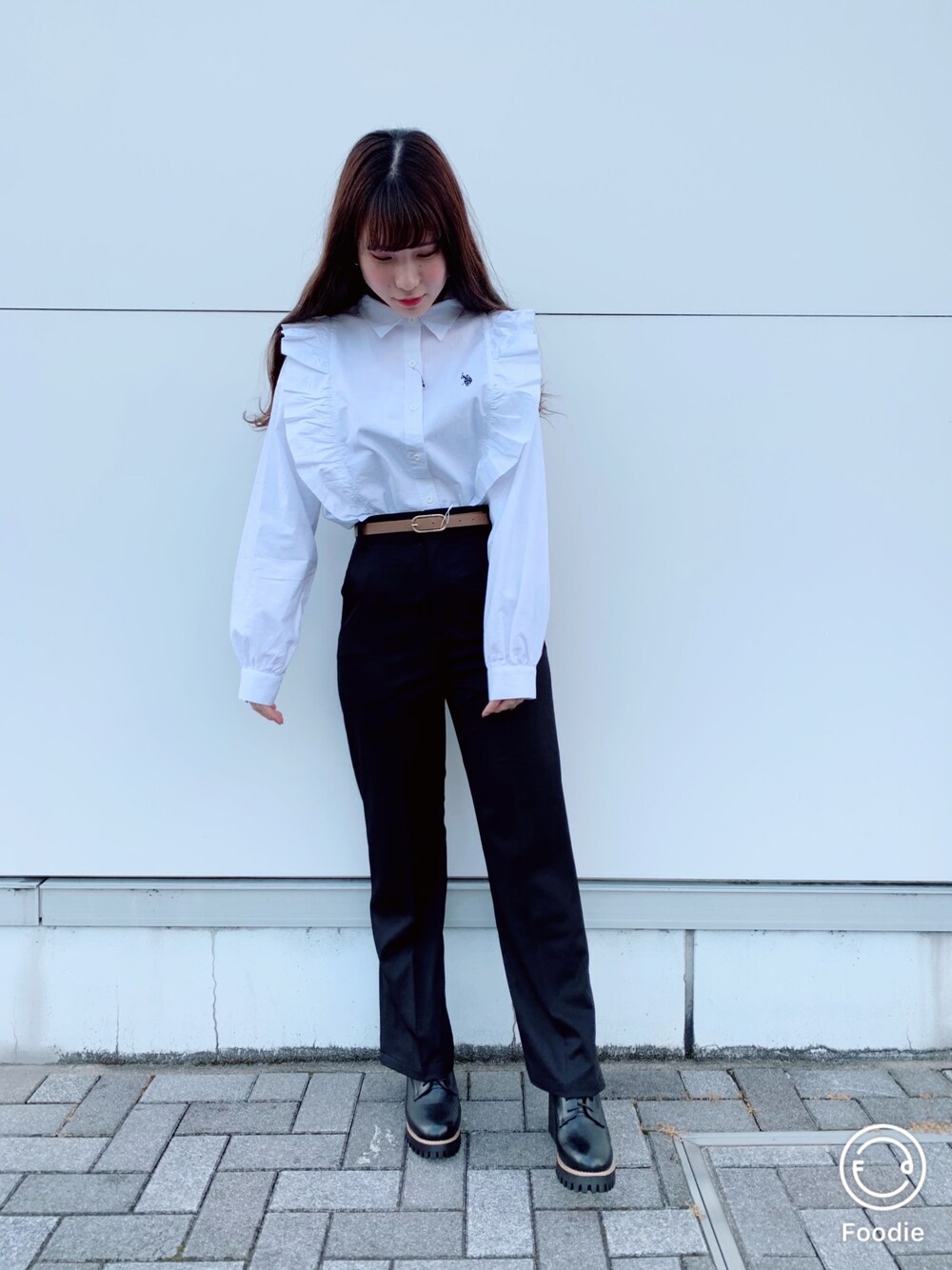 お仕事のこーで🖤 POLOのシャツが可愛くて、、、 でも、黒のパンツで大人っぽくしてます! ガーリーだけど、大人可愛いにしました! よかったら、InstagramのプロフィールのURLから商品見れるので見てください🧸