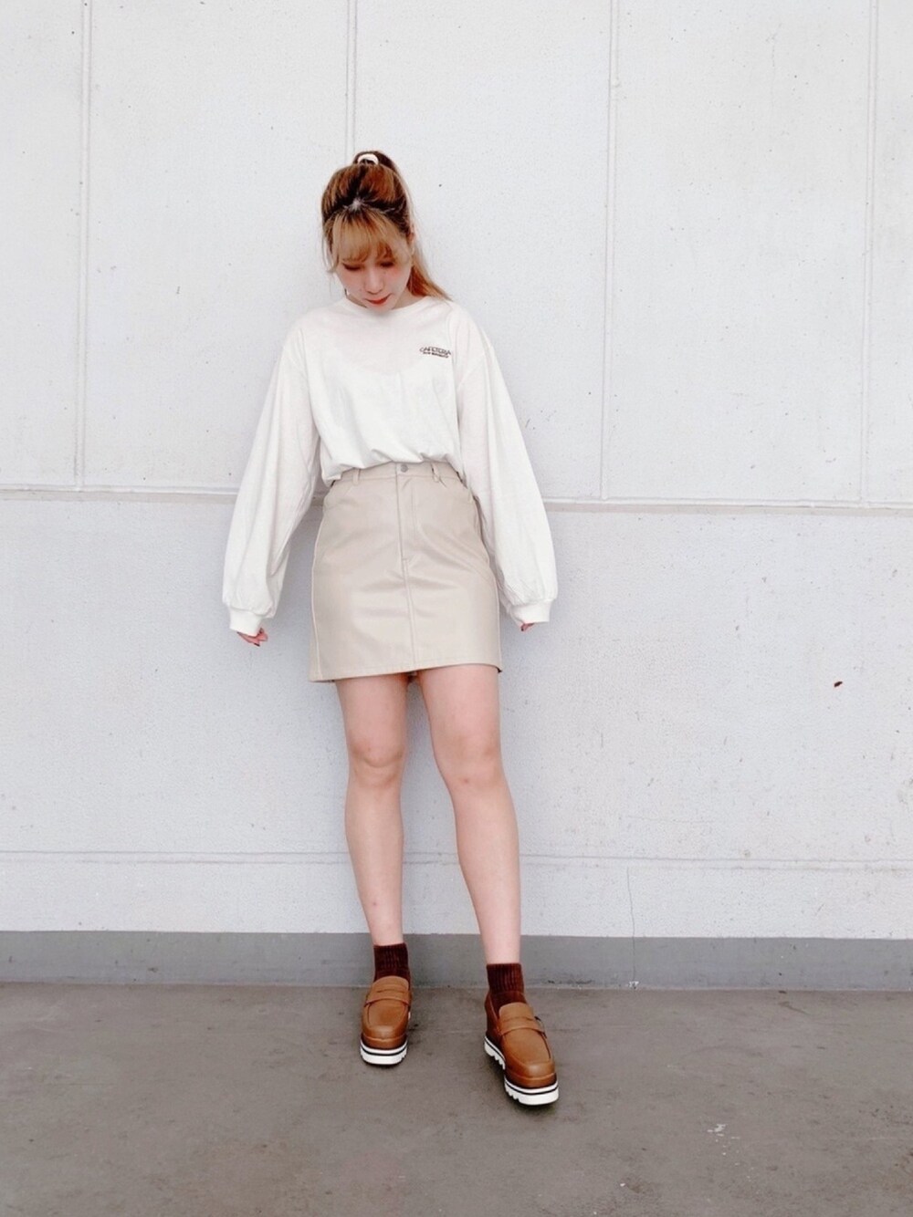 シンプルコーデです〜⭐️ フェイクレザースカート可愛い〜😌 今年トレンドのロンTと合わせてお洒落です☺︎