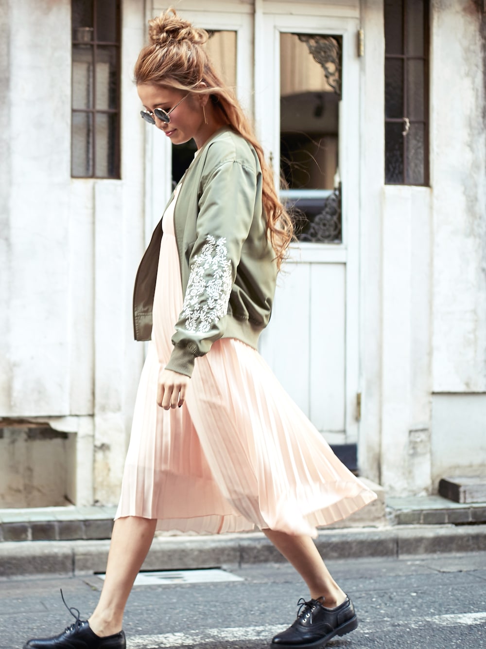 甘めのプリーツキャミワンピにあえてブルゾンを合わせて甘すぎないカジュアルなスタイルにしました。ブルゾンの袖にはさりげなく刺繍がほどこされているので、無地のキャミワンピに合わせるとアクセントになります。 ▽MA-1風/袖刺繍ブルゾン…¥3676(+税)SWEW0006960 ▽無地プリーツキャミワンピース…¥2900(+税)SWEW0006790