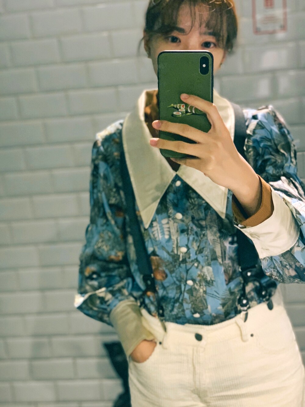 ブルー系のシャツ/ブラウスを着用したレディースの秋コーディネートの1枚目の写真